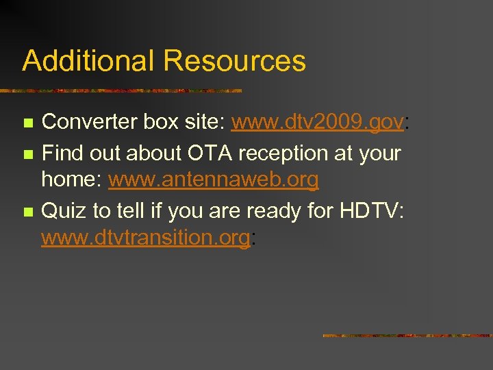 Additional Resources n n n Converter box site: www. dtv 2009. gov: Find out about OTA reception at your home: www. antennaweb. org Quiz to tell if you are ready for HDTV: www. dtvtransition. org: