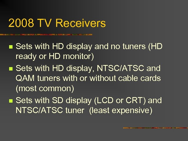 2008 TV Receivers n n n Sets with HD display and no tuners (HD ready or HD monitor) Sets with HD display, NTSC/ATSC and QAM tuners with or without cable cards (most common) Sets with SD display (LCD or CRT) and NTSC/ATSC tuner (least expensive)