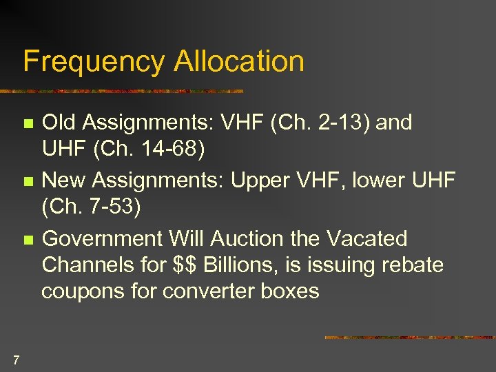 Frequency Allocation n 7 Old Assignments: VHF (Ch. 2 -13) and UHF (Ch. 14 -68) New Assignments: Upper VHF, lower UHF (Ch. 7 -53) Government Will Auction the Vacated Channels for $$ Billions, is issuing rebate coupons for converter boxes