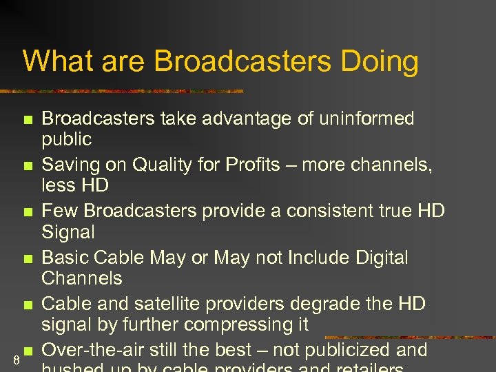 What are Broadcasters Doing n n n 8 n Broadcasters take advantage of uninformed public Saving on Quality for Profits – more channels, less HD Few Broadcasters provide a consistent true HD Signal Basic Cable May or May not Include Digital Channels Cable and satellite providers degrade the HD signal by further compressing it Over-the-air still the best – not publicized and