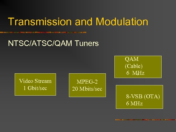 Transmission and Modulation NTSC/ATSC/QAM Tuners QAM (Cable) 6 MHz + Video Stream 1 Gbit/sec MPEG-2 20 Mbits/sec 8 -VSB (OTA) 6 MHz