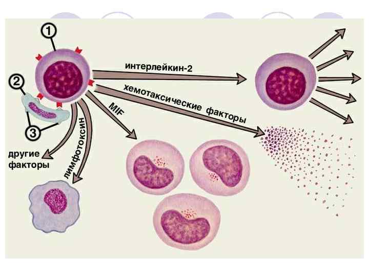 Патогенез аллергической реакции замедленного типа: Общий механизм развития аллергической реакции замедленного типа. После образования комплекса, состоящего из сенсибилизированного лимфоцита (1) и клетки мишени (2), содержащей аллерген (3), происходит выделение различных лимфокинов — интерлейкина 2, стимулирующего В лимфоциты, хемотаксических факторов, вызывающих хемотаксис лейкоцитов, фактора, ингибирующего движение макрофагов (MIF) и вызывающего их накопление, а также лимфотоксина, повреждающего расположенные рядом клетки, и других факторов.