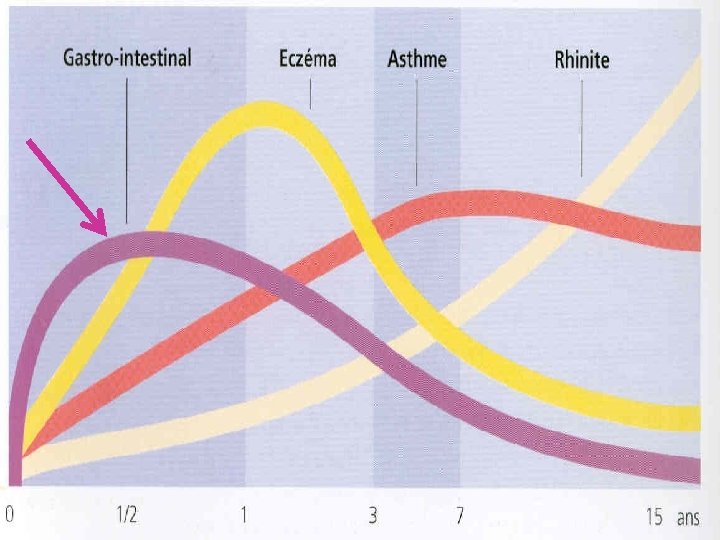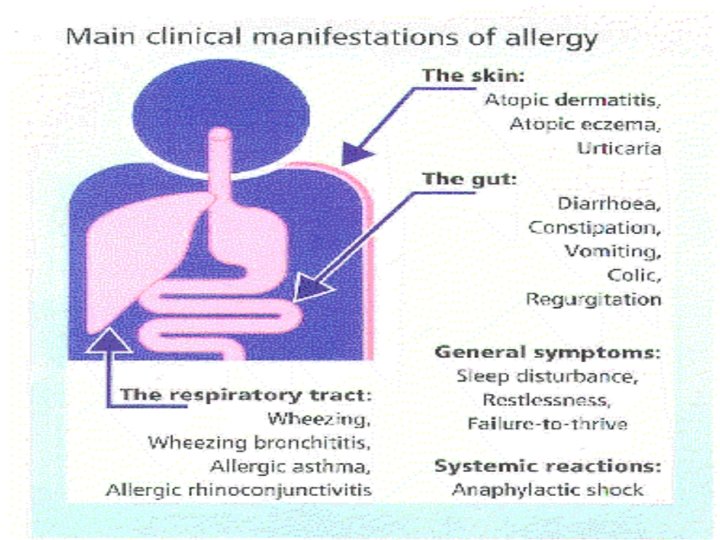 Eventail des manifestations: s’est élargi q v v Réactions Ig. E mediées: Systémiques: (anaphylaxie) Manifestations gastrointestinales n A. syndrome oral n B. Réactions GI Ig. E médiées Manifestations respiratoires : Asthme et rhinite q v Réactions non Ig. E mediées et mixtes: R° gastrointestinales Ig. Emediées: RGO: Vts, régurgitaions oesophagite à éosinophiles, Entérocolites, proctocolites, Entéropathies, constipation, Colon irritable, Coliques rebelles du nourrisson Manifestations cutanées v Manifestations D’apparition immédiate respiratoires: syndrome de Heiner 1. urticaire ou angioedème 2. urticaire de contact Dermatite atopique