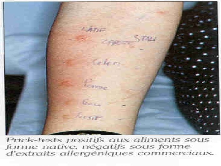 Test cutanés n n Réalisés en PRICK-TESTS sans limite d âge Extraits standardisés ou aliments frais Interprétation : Papule > 3 mm / témoin positif § n n n Aliments cuits et crus V. P. P. : 25 à 75% Excellente VPN : 82à 100% Bon marqueur pour écarter une AA Pour le lait et l’œuf, VPP avoisinerait les 100% lorsque le diamètre de la papule est > 6 mm avant l’âge de 2 ans et > 8 mm après l’âge de 2 ans* Prudence en cas de choc anaphylactique Étudient la réactivité immédiate (r° IGE médiées ) Faciles , rapides , testent plusieurs allergènes * Du Toit G et al. Pediatr Allergy Immunol 2009; 20: 309– 19.