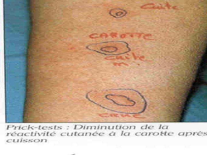 CAS CLINIQUE 3 n n n Enfant de 7 ans A l’ingestion de jus de carotte: diarrhée + éruption (rash? ) Deuxième épisode après avoir mangé de la carotte : rash cutané Mange des carottes cuites TCA – Que faire? q Poursuivre le régime d’éviction? q Réintroduire la carotte? TPO carotte crue: aucun incident