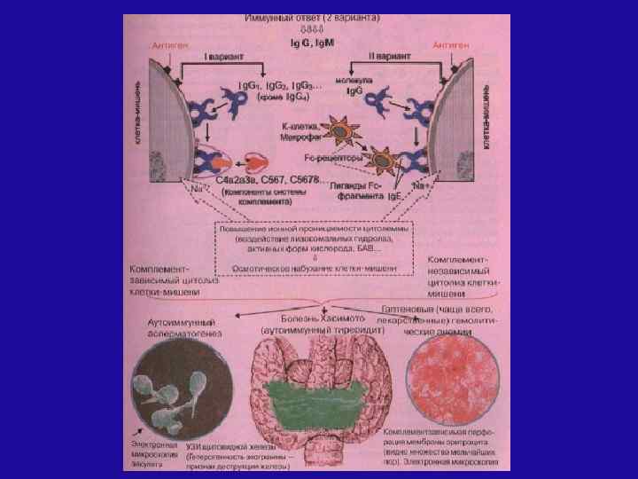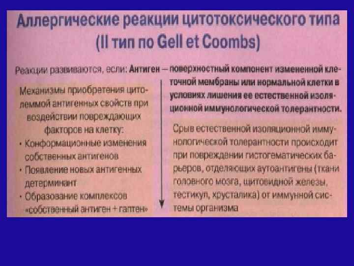 Патогенез: Образуется комплекс антиген – антитело, который адсорбирует на себе и активирует компоненты комплемента лизис клетки – мишени и последующее удаление их путем фагоцитоза. Выделяются медиаторы: активированные компоненты комплемента, оксиданты, лизосомальные ферменты. В клинике цитотоксический тип реакции может быть проявлением лекарственной аллергии в виде лейкопении, тромбоцитопении, гематологической анемии и др. Это может быть при тиреоидите Хашимото, симпатической офтальмопатии, многочисленных гемотрансфузиях, аутоиммунных гемолитических анемиях, тромбоцитопениях и др.