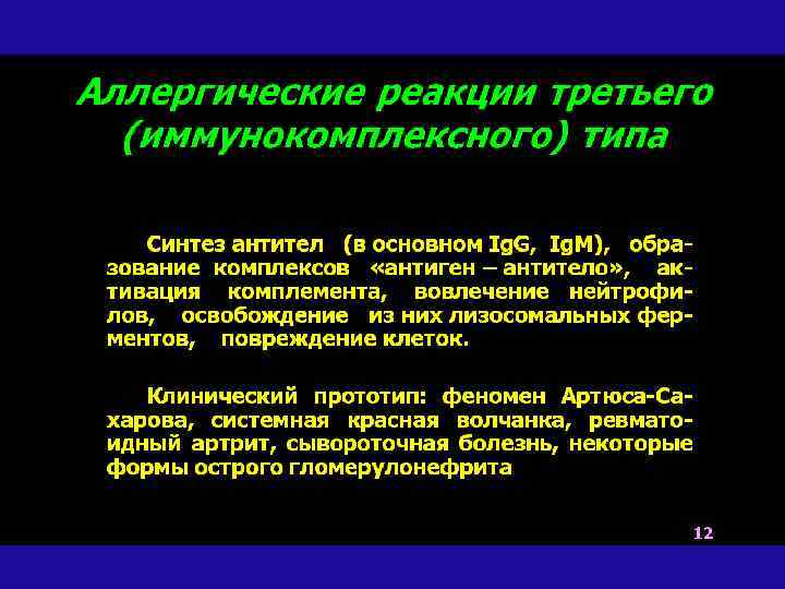 Повреждающее действие реализуется через биологически активные вещества (БАВ): v v v Активированный комплемент; Лизосомальные ферменты; Супероксидный радикал; Гистамин; Серотонин; Брадикинин и др. Прямое повреждающее действие иммунных комплексов проявляется развитием аллергического воспаления с альтернацией, эксудацией и пролиферацией. Развиваются васкулиты. III тип реакций является ведущим в развитии сывороточной болезни, гломерулонефрита, аутоиммунных заболеваний (ревматоидный артрит и др. )