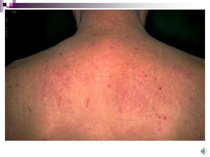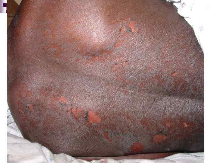 Клиника токсикодермий n n n Ранняя реакция может возникнуть через 2 -3 суток после лечения, поздняя – у несенсибилизированных на 9 сутки. Реакция на пенициллин иногда наблюдается через 2 недели после его отмены СЫПЬ: пятна, папулы, везикулы, иногда – пустулы; волдыри. Возможно развитие эксфолиативной (пузыри) эритродермии, особенно если препарат не отменен. Сыпь исчезая, оставляет после себя шелушение. Иногда – многоформная экксудативная эритема. Цвет – ярко-красный, потом лиловый или коричневый Сыпь сливающаяся, симметричная, зудящая. Локализация: туловище, конечности.