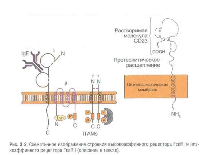 Аллерген-специфичный Ig. E и FcεRI Ig. E — 8 S мономерный Ig (т. е. его молекула содержит 2 тяжелые ε- и 2 легкие цепи). Характерные особенности структуры ε-цепи — наличие 4 х С-доменов (вместо трех в γ- и α-цепях), обеспечивающее большее пространство для взаимодействия с Fc-рецептором Наиболее специфичен Ig. E контроль, осуществляемый при участии Fcε-RIII (CD 23). Этот рецептор экспрессируют В-лa, а при аллергии — также Т-кл и Мо. Взаимодействуя с молекулой CD 21 В-лф, CD 23 запускает сигнал, способствующий переключению синтеза Ig на Ig. E.