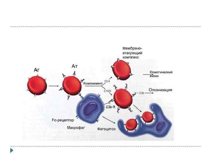Механизм гиперчувствительности II Иммунный цитолиз, опосредованный вз-м Ig. M и Ig. G с АГ кл-мишеней : 1) Активация с-мы комплимента лизис/фагоцитоз 2) АЗКОЦ Выделяют 3 группы заболеваний: аллоиммунные гемолитические заболевания аутоиммунная цитотоксическая патология гемолитические процессы, связанные с лекарственной гиперчувствительностью