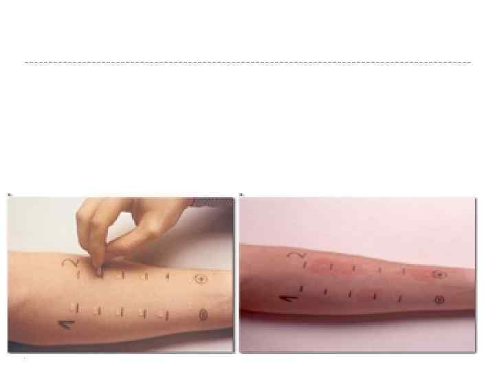 2) Кожные пробы Этот метод – один из основных в диагностике Ig. E опоср. ГНТ. Высокая специфичность Высокая информативность Тестирование проводят на коже предплечья (у детей – на коже спины) Противопоказания: § Остр. инф заболевания § Обострение хронич. заб-й § Тяж формы БА § Декомпенсир. заб-я печени, почек, ССС, эндокр. с-мы § Туберкулез, сифилис, бруцеллез, СПИД § АИЗ в ст обострения § ПИД § Анафил. шок в анамнезе § Онкология § Психич. заб-я § Беременность и лактация