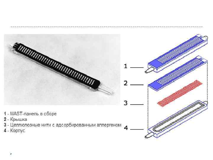 MAST-CLA Для проведения теста используется МAСT-аллергопанель, представляющая собой полый прозрачный пластмассовый корпус с параллельно расположенными внутри тончайшими нитями, на которых с использованием уникальной технологии сорбированы аллергены.