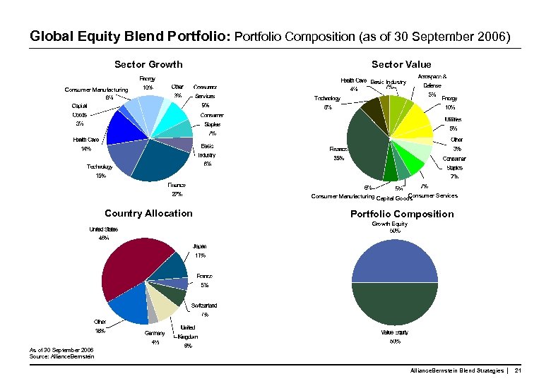 Blend Moderates Sector Risk of Components: Region Weights Active Weights* Value Growth Blend Emerging Markets Other Asia/Pacific Japan Europe North America As of 30 September 2006 *versus MSCI World Index; Totals may not add due to rounding Source: MSCI and Alliance. Bernstein Blend Strategies 20