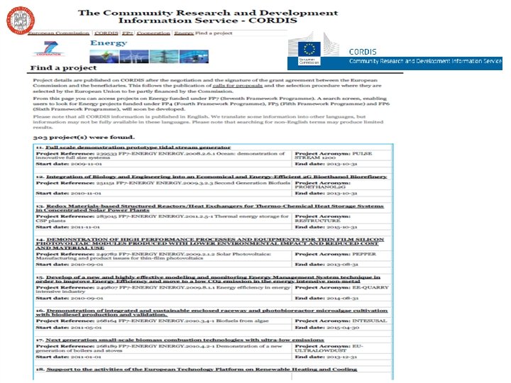 TARGETS: • • • Improve energy efficiency throughout the energy system. Accelerate the penetration of renewable energy sources. Decarbonise power generation and, in the longer term, substantially decarbonise transport. Reduce greenhouse gas emissions. Diversify Europe's energy mix. Enhance the competitiveness of European industry including a better involvement of SMEs. MAIN TOPICS: • • • Hydrogen and fuel cells - Research in this area is funded through the Fuel Cells and Hydrogen Joint Undertaking (FCH JU). Renewable electricity generation - technologies to increase overall conversion efficiency, cost efficiency and reliability, driving down the cost of electricity production. Renewable fuel production - fuel production systems and conversion technologies. Renewables for heating and cooling - technologies for cheaper, more efficient active and passive heating and cooling from renewable energy sources. CO 2 capture and storage technologies for zero emission power generation - technologies reducing the environmental impact of fossil fuel use by capturing CO 2. Clean Coal Technologies - substantially improve power plant efficiency, reliability and reducing costs through research, development and demonstration of cleaner coal and other solid fuel conversion technologies, producing also secondary energy carriers (including hydrogen) and liquid or gaseous fuels. Smart energy networks - increasing the efficiency, safety, reliability and quality of the European electricity and gas systems and networks in the context of a more integrated European energy market. Energy efficiency and savings - technologies to improve energy efficiency and to enable final and primary energy consumption savings, over their life-cycle, for buildings (including lighting), transport, services and industry. Knowledge for energy policy making - tools, methods and models to assess the economic and social issues related to energy technologies and to provide quantifiable targets and scenarios for medium and long term horizons.