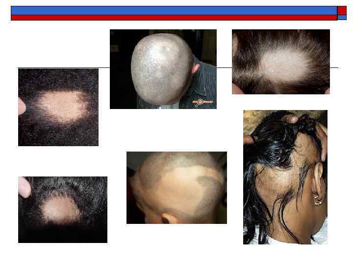 Ятрогенные алопеции o o Травматическая (тракционная) алопеция связана с насильственным выдергиванием волос вследствие физической травмы (маргинальная алопеция при травматичных прическах, очаговая тракционная алопеция при травматизации, постоперационная алопеция) Рубцовая алопеция (при ожоге, нерациональной дарсонвализации, использовании неисправной электроаппаратуры)
