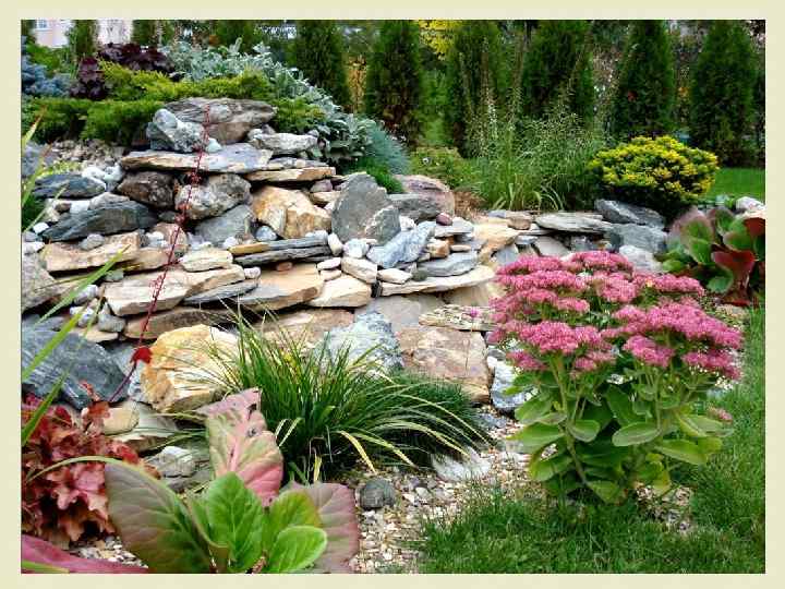 Альпийская горка Это участок сада с искусственным сооружением из камней и растений высокогорной растительности. Этот любимый многими элемент ландшафтного дизайна берет свое начало и название высоко в горах, где в расщелинах камней, как бы "вопреки суровой судьбе" поселяются растения, поражающие разнообразием форм и окраски цветов. Главным образующим фактором таких уголков является камень, а растения лишь дополняют и обрамляют глыбы. Подражая природе, человек стал сооружать альпийские горки, отказываясь от крупных растений и находя красоту в природной форме камней, даже их щелях и трещинах.