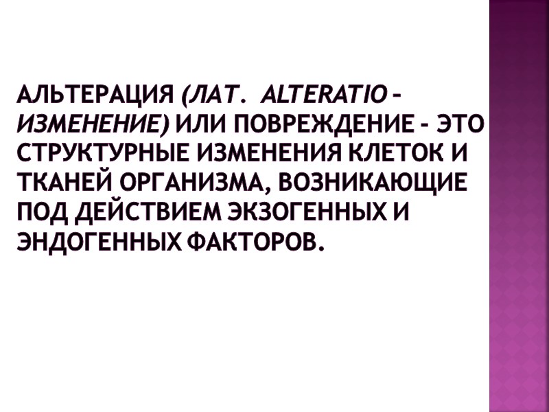 Альтерация (лат. alteratio – изменение) или повреждение - это структурные изменения клеток и тканей организма, возникающие под действием экзогенных и эндогенных факторов.