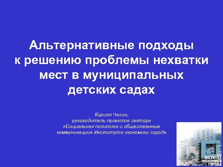 Альтернативные подходы к решению проблемы нехватки мест в муниципальных детских садах Кирилл Чагин, руководитель проектов сектора «Социальная политика и общественные коммуникации» Института экономики города