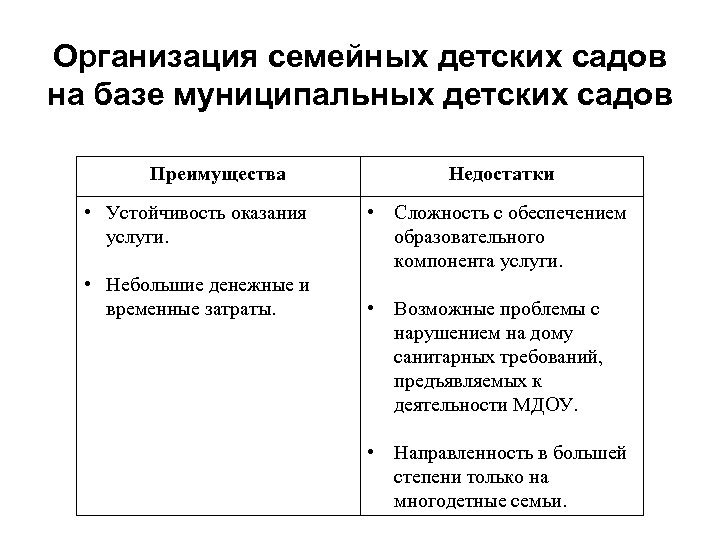 Организация семейных детских садов на базе муниципальных детских садов Преимущества • Устойчивость оказания услуги. • Небольшие денежные и временные затраты. Недостатки • Сложность с обеспечением образовательного компонента услуги. • Возможные проблемы с нарушением на дому санитарных требований, предъявляемых к деятельности МДОУ. • Направленность в большей степени только на многодетные семьи.