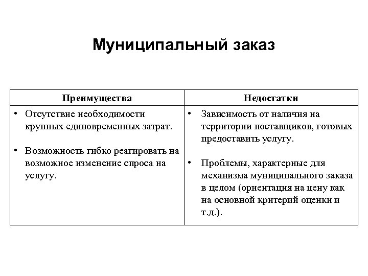 Муниципальный заказ Преимущества • Отсутствие необходимости крупных единовременных затрат. Недостатки • Зависимость от наличия на территории поставщиков, готовых предоставить услугу. • Возможность гибко реагировать на возможное изменение спроса на • Проблемы, характерные для услугу. механизма муниципального заказа в целом (ориентация на цену как на основной критерий оценки и т. д. ).