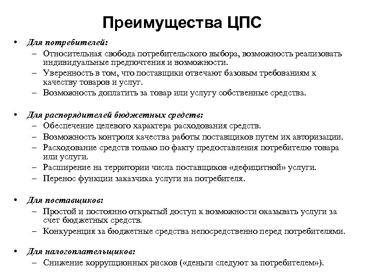 Преимущества ЦПС • Для потребителей: – Относительная свобода потребительского выбора, возможность реализовать индивидуальные предпочтения и возможности. – Уверенность в том, что поставщики отвечают базовым требованиям к качеству товаров и услуг. – Возможность доплатить за товар или услугу собственные средства. • Для распорядителей бюджетных средств: – Обеспечение целевого характера расходования средств. – Возможность контроля качества работы поставщиков путем их авторизации. – Расходование средств только по факту предоставления потребителю товара или услуги. – Расширение на территории числа поставщиков «дефицитной» услуги. – Перенос функции заказчика услуги на потребителя. • Для поставщиков: – Простой и постоянно открытый доступ к возможности оказывать услуги за счет бюджетных средств. – Конкуренция за бюджетные средства непосредственно перед потребителями. • Для налогоплательщиков: – Снижение коррупционных рисков ( «деньги следуют за потребителем» ).