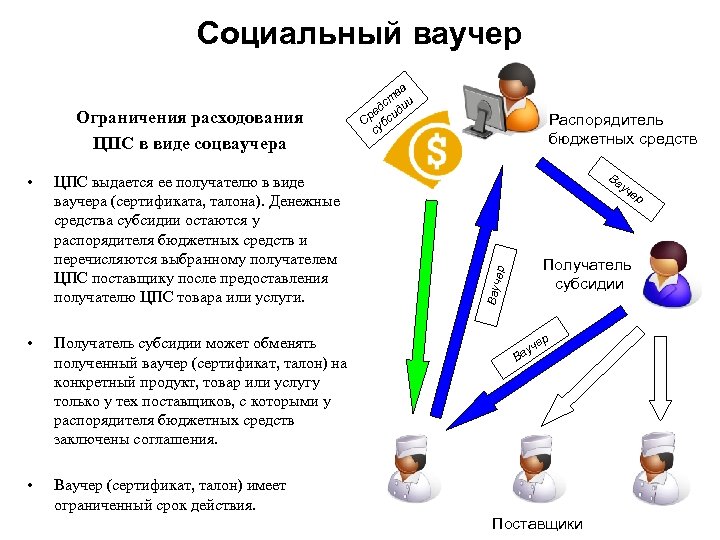 Социальный ваучер ЦПС выдается ее получателю в виде ваучера (сертификата, талона). Денежные средства субсидии остаются у распорядителя бюджетных средств и перечисляются выбранному получателем ЦПС поставщику после предоставления получателю ЦПС товара или услуги. • Получатель субсидии может обменять полученный ваучер (сертификат, талон) на конкретный продукт, товар или услугу только у тех поставщиков, с которыми у распорядителя бюджетных средств заключены соглашения. • Ва у че р Получатель субсидии ер • Распорядитель бюджетных средств Вауч Ограничения расходования ЦПС в виде соцваучера ва ст ии д ре сид С уб с р Ваучер (сертификат, талон) имеет ограниченный срок действия. че ау В Поставщики