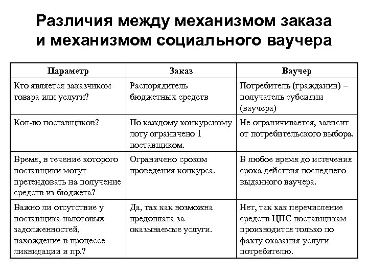 Различия между механизмом заказа и механизмом социального ваучера Параметр Заказ Ваучер Кто является заказчиком товара или услуги? Распорядитель бюджетных средств Потребитель (гражданин) – получатель субсидии (ваучера) Кол-во поставщиков? По каждому конкурсному Не ограничивается, зависит лоту ограничено 1 от потребительского выбора. поставщиком. Время, в течение которого Ограничено сроком поставщики могут проведения конкурса. претендовать на получение средств из бюджета? В любое время до истечения срока действия последнего выданного ваучера. Важно ли отсутствие у поставщика налоговых задолженностей, нахождение в процессе ликвидации и пр. ? Нет, так как перечисление средств ЦПС поставщикам производится только по факту оказания услуги потребителю. Да, так как возможна предоплата за оказываемые услуги.