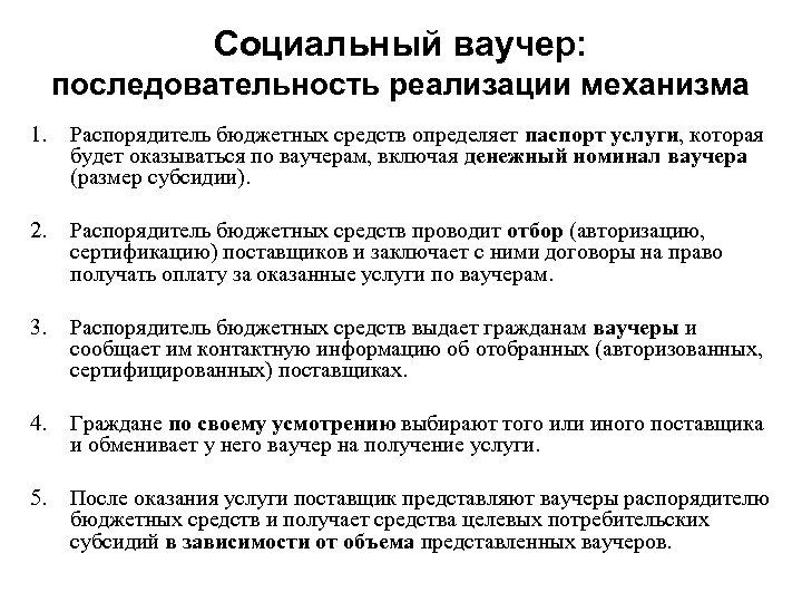 Социальный ваучер: последовательность реализации механизма 1. Распорядитель бюджетных средств определяет паспорт услуги, которая будет оказываться по ваучерам, включая денежный номинал ваучера (размер субсидии). 2. Распорядитель бюджетных средств проводит отбор (авторизацию, сертификацию) поставщиков и заключает с ними договоры на право получать оплату за оказанные услуги по ваучерам. 3. Распорядитель бюджетных средств выдает гражданам ваучеры и сообщает им контактную информацию об отобранных (авторизованных, сертифицированных) поставщиках. 4. Граждане по своему усмотрению выбирают того или иного поставщика и обменивает у него ваучер на получение услуги. 5. После оказания услуги поставщик представляют ваучеры распорядителю бюджетных средств и получает средства целевых потребительских субсидий в зависимости от объема представленных ваучеров.