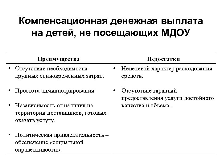Компенсационная денежная выплата на детей, не посещающих МДОУ Преимущества Недостатки • Отсутствие необходимости крупных единовременных затрат. • Нецелевой характер расходования средств. • Простота администрирования. • Отсутствие гарантий предоставления услуги достойного качества и объема. • Независимость от наличия на территории поставщиков, готовых оказать услугу. • Политическая привлекательность – обеспечение «социальной справедливости» .
