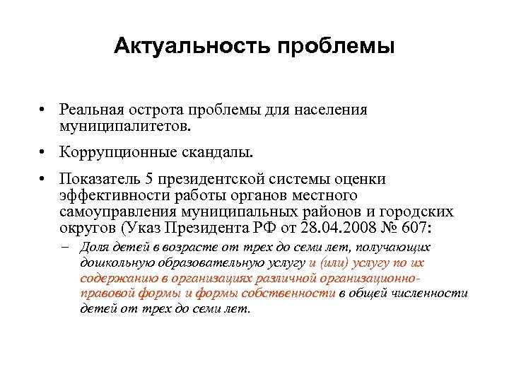 Актуальность проблемы • Реальная острота проблемы для населения муниципалитетов. • Коррупционные скандалы. • Показатель 5 президентской системы оценки эффективности работы органов местного самоуправления муниципальных районов и городских округов (Указ Президента РФ от 28. 04. 2008 № 607: – Доля детей в возрасте от трех до семи лет, получающих дошкольную образовательную услугу и (или) услугу по их содержанию в организациях различной организационноправовой формы и формы собственности в общей численности детей от трех до семи лет.