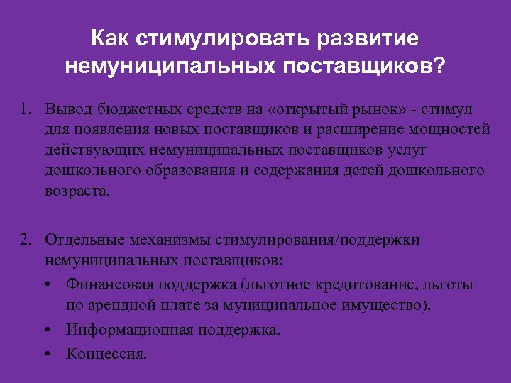 Как стимулировать развитие немуниципальных поставщиков? 1. Вывод бюджетных средств на «открытый рынок» - стимул для появления новых поставщиков и расширение мощностей действующих немуниципальных поставщиков услуг дошкольного образования и содержания детей дошкольного возраста. 2. Отдельные механизмы стимулирования/поддержки немуниципальных поставщиков: • Финансовая поддержка (льготное кредитование, льготы по арендной плате за муниципальное имущество). • Информационная поддержка. • Концессия.