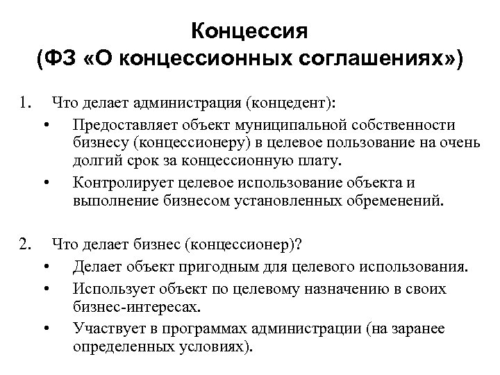 Концессия (ФЗ «О концессионных соглашениях» ) 1. Что делает администрация (концедент): • Предоставляет объект муниципальной собственности бизнесу (концессионеру) в целевое пользование на очень долгий срок за концессионную плату. • Контролирует целевое использование объекта и выполнение бизнесом установленных обременений. 2. Что делает бизнес (концессионер)? • Делает объект пригодным для целевого использования. • Использует объект по целевому назначению в своих бизнес-интересах. • Участвует в программах администрации (на заранее определенных условиях).