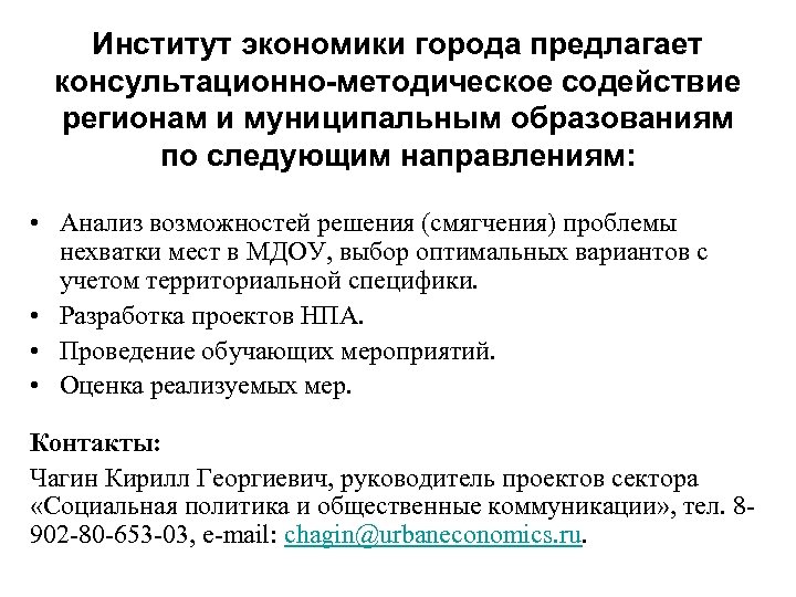 Институт экономики города предлагает консультационно-методическое содействие регионам и муниципальным образованиям по следующим направлениям: • Анализ возможностей решения (смягчения) проблемы нехватки мест в МДОУ, выбор оптимальных вариантов с учетом территориальной специфики. • Разработка проектов НПА. • Проведение обучающих мероприятий. • Оценка реализуемых мер. Контакты: Чагин Кирилл Георгиевич, руководитель проектов сектора «Социальная политика и общественные коммуникации» , тел. 8902 -80 -653 -03, e-mail: chagin@urbaneconomics. ru.