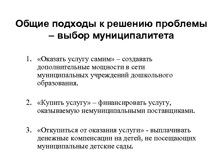 Общие подходы к решению проблемы – выбор муниципалитета 1. «Оказать услугу самим» – создавать дополнительные мощности в сети муниципальных учреждений дошкольного образования. 2. «Купить услугу» – финансировать услугу, оказываемую немуниципальными поставщиками. 3. «Откупиться от оказания услуги» - выплачивать денежные компенсации на детей, не посещающих муниципальные детские сады.