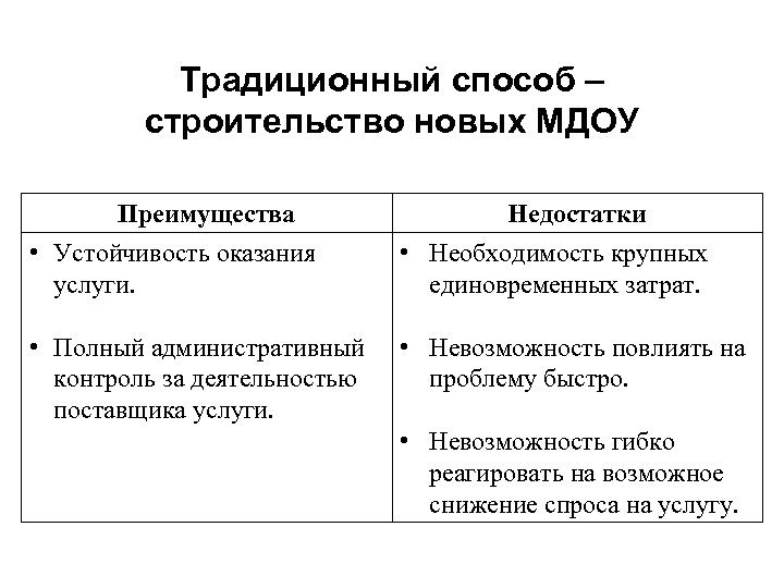 Традиционный способ – строительство новых МДОУ Преимущества • Устойчивость оказания услуги. Недостатки • Необходимость крупных единовременных затрат. • Полный административный контроль за деятельностью поставщика услуги. • Невозможность повлиять на проблему быстро. • Невозможность гибко реагировать на возможное снижение спроса на услугу.