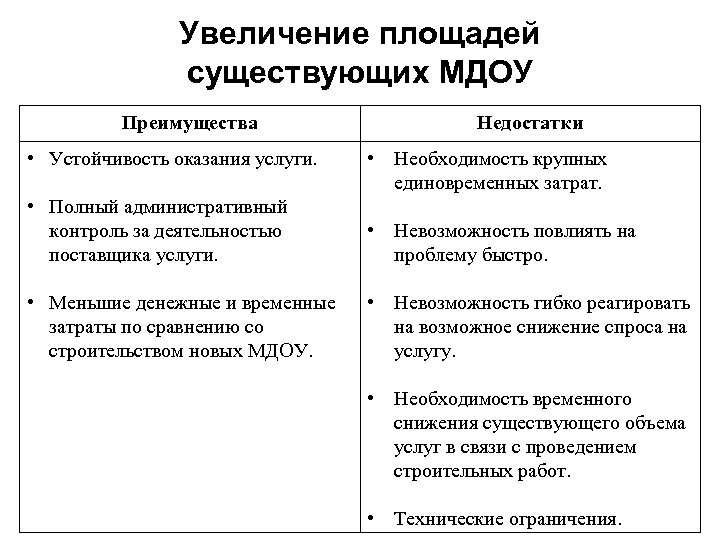 Увеличение площадей существующих МДОУ Преимущества • Устойчивость оказания услуги. Недостатки • Необходимость крупных единовременных затрат. • Полный административный контроль за деятельностью поставщика услуги. • Невозможность повлиять на проблему быстро. • Меньшие денежные и временные затраты по сравнению со строительством новых МДОУ. • Невозможность гибко реагировать на возможное снижение спроса на услугу. • Необходимость временного снижения существующего объема услуг в связи с проведением строительных работ. • Технические ограничения.