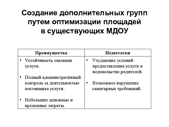 Создание дополнительных групп путем оптимизации площадей в существующих МДОУ Преимущества • Устойчивость оказания услуги. • Полный административный контроль за деятельностью поставщика услуги. • Небольшие денежные и временные затраты. Недостатки • Ухудшение условий предоставления услуги и недовольство родителей. • Возможное нарушение санитарных требований.
