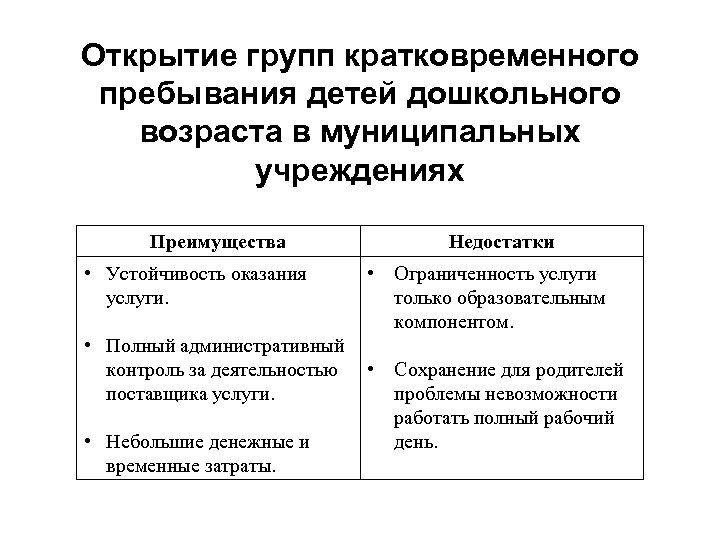 Открытие групп кратковременного пребывания детей дошкольного возраста в муниципальных учреждениях Преимущества • Устойчивость оказания услуги. • Полный административный контроль за деятельностью поставщика услуги. • Небольшие денежные и временные затраты. Недостатки • Ограниченность услуги только образовательным компонентом. • Сохранение для родителей проблемы невозможности работать полный рабочий день.