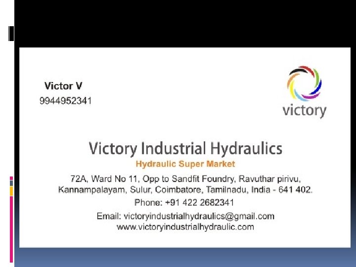 VICTORY INDUSTRIAL HYDRAULICS 72 A, Ward no 11, Opp to Sandfit Foundry, Ravuthar pirivu, Kannampalayam, Sulur, Coimbatore, Tamilnadu, India. Pin 641 402. Phone ; +91 422 2682341, Mbl ; +919944952341 Email; victoryindustrialhydraulics@gmail. com Web; www. victoryindustrialhydraulic. com, Skype; victoryindustrialhydraulics Linked i. N; victoryindustrialhydraulics Facebook; victoryindustrialhydraulics ISO 9001 -2008 Certified Company.
