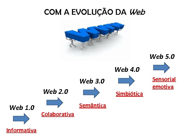 COM A EVOLUÇÃO DA Web 5. 0 Web 4. 0 Web 3. 0 Web 2. 0 Web 1. 0 Informativa Simbiótica Semântica Colaborativa Sensorial emotiva