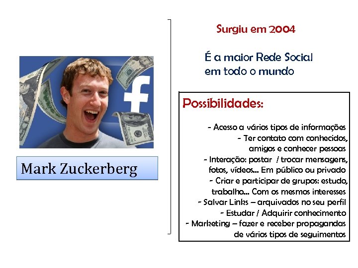 Surgiu em 2004 É a maior Rede Social em todo o mundo Possibilidades: Mark Zuckerberg - Acesso a vários tipos de informações - Ter contato com conhecidos, amigos e conhecer pessoas - Interação: postar / trocar mensagens, fotos, vídeos. . . Em público ou privado - Criar e participar de grupos: estudo, trabalho. . . Com os mesmos interesses - Salvar Links – arquivados no seu perfil - Estudar / Adquirir conhecimento - Marketing – fazer e receber propagandas de vários tipos de seguimentos