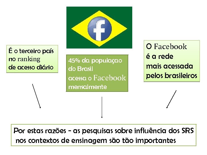 É o terceiro país no ranking de acesso diário 45% da populaçao do Brasil acessa o Facebook mensalmente O Facebook é a rede mais acessada pelos brasileiros Por estas razões - as pesquisas sobre influência dos SRS nos contextos de ensinagem são tão importantes