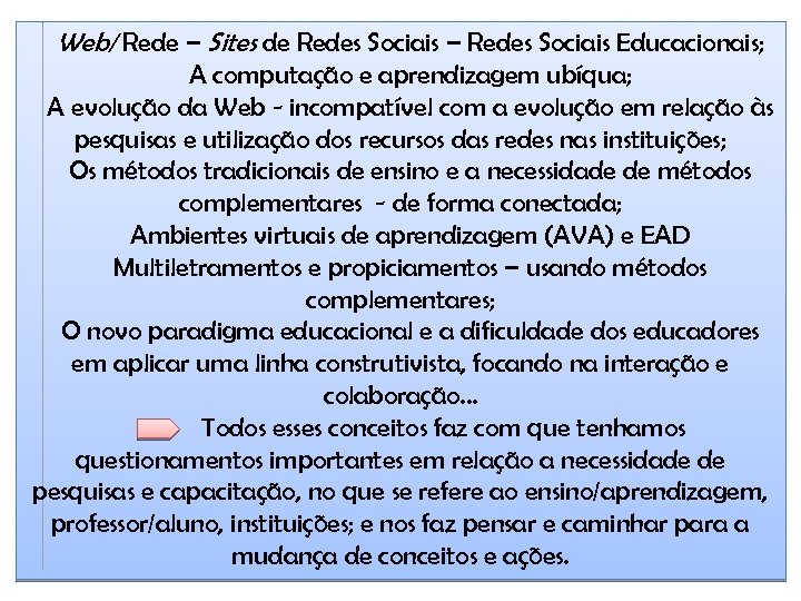Web/ Rede – Sites de Redes Sociais – Redes Sociais Educacionais; A computação e aprendizagem ubíqua; A evolução da Web - incompatível com a evolução em relação às pesquisas e utilização dos recursos das redes nas instituições; Os métodos tradicionais de ensino e a necessidade de métodos complementares - de forma conectada; Ambientes virtuais de aprendizagem (AVA) e EAD Multiletramentos e propiciamentos – usando métodos complementares; O novo paradigma educacional e a dificuldade dos educadores em aplicar uma linha construtivista, focando na interação e colaboração. . . Todos esses conceitos faz com que tenhamos questionamentos importantes em relação a necessidade de pesquisas e capacitação, no que se refere ao ensino/aprendizagem, professor/aluno, instituições; e nos faz pensar e caminhar para a mudança de conceitos e ações.