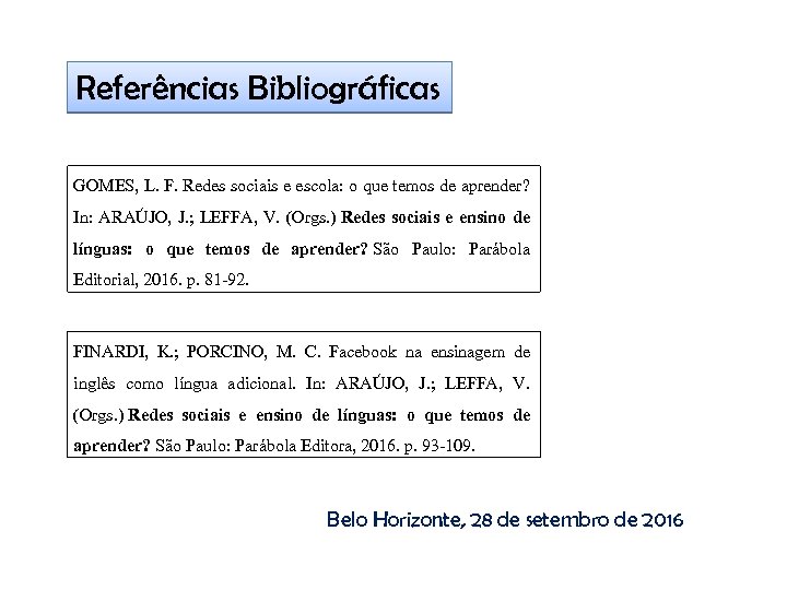 Referências Bibliográficas GOMES, L. F. Redes sociais e escola: o que temos de aprender? In: ARAÚJO, J. ; LEFFA, V. (Orgs. ) Redes sociais e ensino de línguas: o que temos de aprender? São Paulo: Parábola Editorial, 2016. p. 81 -92. FINARDI, K. ; PORCINO, M. C. Facebook na ensinagem de inglês como língua adicional. In: ARAÚJO, J. ; LEFFA, V. (Orgs. ) Redes sociais e ensino de línguas: o que temos de aprender? São Paulo: Parábola Editora, 2016. p. 93 -109. Belo Horizonte, 28 de setembro de 2016