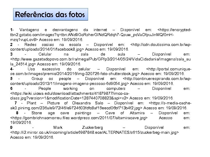 Referências das fotos 1 - Vantagens e desvantagens da internet – Disponível em: <https: //encryptedtbn 2. gstatic. com/images? q=tbn: ANd 9 Gc. Rsher. GINd. QRdqh 7 -Qsuw_pc. Vx. Ofpu. Jin. MQf 0 m. Hmzq 1 vup. Lov 8> Acesso em: 19/09/2016. 2 - Redes sociais na escola – Disponível em: <http: //cdn. doutissima. com. br/wpcontent/uploads/2014/01/facebook 8. jpg> Acesso em: 19/09/2016. 3 - Celular na sala de aula – Disponível em: <http: //www. gazetadopovo. com. br/ra/mega/Pub/GP/p 3/2014/05/24/Vida. Cidadania/Imagens/sala_au la_24514. jpg> Acesso em: 19/09/2016. 4 - Uso excessivo do celular – Disponível em: <http: //portal. comuniquese. com. br/images/premio/2014/2016/img-320726 -foto-shutterstock. jpg> Acesso em: 19/09/2016. 5 - Group os people – Disponível em: <http: //continuerespirando. com. br/wpcontent/uploads/2013/11/imagens-pessoas-6 d 9054. jpg> Acesso em: 19/09/2016. 6 - People working on computers – Disponível em: <https: //wiki. uiowa. edu/download/attachments/41879877/imco-caclass. jpg? version=1&modification. Date=1287440708823&api=v 2> Acesso em: 19/09/2016. 7 - Plant – Picture of Olexandra Salo – Disponível em: <https: //s-media-cacheak 0. pinimg. com/236 x/e 9/72/46/e 9724603 fdfc 8 af 15 eecd 06 bf 713 b 4 f 2. jpg> Acesso em: 19/09/2016. 8 - Stone age cave paintings – Cave of Altamira – Disponível em: <https: //gombrichnaomorreu. files. wordpress. com/2011/07/altamiracave. jpg> Acesso em: 19/09/2016. 9 - Mark Zuckerberg – Disponível em: <http: //i 2. mirror. co. uk/incoming/article 6987848. ece/ALTERNATES/s 615/zuckerbeg-main. jpg> Acesso em: 19/09/2016.