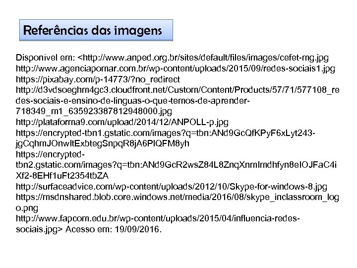 Referências das imagens Disponível em: <http: //www. anped. org. br/sites/default/files/images/cefet-mg. jpg http: //www. agenciapomar. com. br/wp-content/uploads/2015/09/redes-sociais 1. jpg https: //pixabay. com/p-14773/? no_redirect http: //d 3 vdsoeghm 4 gc 3. cloudfront. net/Custom/Content/Products/57/71/577108_re des-sociais-e-ensino-de-linguas-o-que-temos-de-aprender 718349_m 1_635923387812948000. jpg http: //plataforma 9. com/upload/2014/12/ANPOLL-p. jpg https: //encrypted-tbn 1. gstatic. com/images? q=tbn: ANd 9 Gc. Qf. KPy. F 6 x. Lyt 243 jg. Cqhm. JOnw. It. Exbteg. Snpq. R 8 j. A 6 Pl. QFM 8 yh https: //encryptedtbn 2. gstatic. com/images? q=tbn: ANd 9 Gc. R 2 ws. Z 84 L 8 Znq. Xnm. Imdhfyn 8 e. IOJFa. C 4 i Xf 2 -8 EHf 1 u. Ft 2354 tb. ZA http: //surfaceadvice. com/wp-content/uploads/2012/10/Skype-for-windows-8. jpg https: //msdnshared. blob. core. windows. net/media/2016/08/skype_inclassroom_log o. png http: //www. fapcom. edu. br/wp-content/uploads/2015/04/influencia-redessociais. jpg> Acesso em: 19/09/2016.