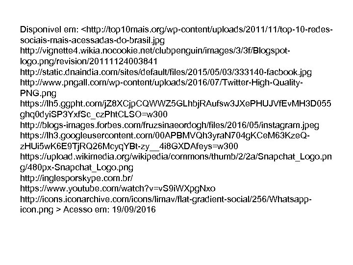 Disponível em: <http: //top 10 mais. org/wp-content/uploads/2011/11/top-10 -redessociais-mais-acessadas-do-brasil. jpg http: //vignette 4. wikia. nocookie. net/clubpenguin/images/3/3 f/Blogspotlogo. png/revision/20111124003841 http: //static. dnaindia. com/sites/default/files/2015/05/03/333140 -facbook. jpg http: //www. pngall. com/wp-content/uploads/2016/07/Twitter-High-Quality. PNG. png https: //lh 5. ggpht. com/j. Z 8 XCjp. CQWWZ 5 GLhbj. RAufsw 3 JXe. PHUJVf. Ev. MH 3 D 055 ghq 0 dyi. SP 3 Yxf. Sc_cz. Pht. CLSO=w 300 http: //blogs-images. forbes. com/fruzsinaeordogh/files/2016/05/instagram. jpeg https: //lh 3. googleusercontent. com/00 APBMVQh 3 yra. N 704 g. KCe. M 63 Kze. Qz. HUi 5 w. K 6 E 9 Tj. RQ 26 Mcyq. YBt-zy__4 i 8 GXDAfeys=w 300 https: //upload. wikimedia. org/wikipedia/commons/thumb/2/2 a/Snapchat_Logo. pn g/480 px-Snapchat_Logo. png http: //inglesporskype. com. br/ https: //www. youtube. com/watch? v=v. S 9 i. WXpg. Nxo http: //icons. iconarchive. com/icons/limav/flat-gradient-social/256/Whatsappicon. png > Acesso em: 19/09/2016