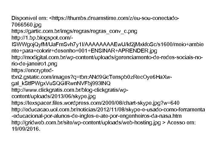 Disponível em: <https: //thumbs. dreamstime. com/z/eu-sou-conectado 7066560. jpg https: //gartic. com. br/imgs/regras_conv_c. png http: //1. bp. blogspot. com/ISWWgoj. Qyf. M/Ua. Fm. Svh 7 y 1 I/AAAAEw. U/kf 2 j. Mxkfo. Sc/s 1600/meio+ambie nte+para+colorir+desenho+001+ENSINAR+APRENDER. jpg http: //modigital. com. br/wp-content/uploads/gerenciamento-de-redes-sociais-norio-de-janeiro 1. png https: //encryptedtbn 2. gstatic. com/images? q=tbn: ANd 9 Gc. Tenspb 0 z. Rec. Oye 6 Ha. Xwgal_k. Stf. PWgx. Vu. SQGIRwn. NVFbj 993 l. NQ http: //www. clickgratis. com. br/blog-clickgratis/wpcontent/uploads/2013/06/skype. jpg https: //lexspacer. files. wordpress. com/2009/08/chart-skype. jpg? w=640 http: //educacao. uol. com. br/noticias/2012/11/08/skype-e-usado-como-ferramenta -educacional-por-alunos-de-ingles-e-ate-por-engenheiros-da-nasa. htm http: //gridweb. com. br/site/wp-content/uploads/web-hosting. jpg > Acesso em: 19/09/2016.