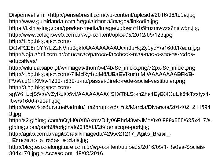 Disponível em: <http: //pensabrasil. com/wp-content/uploads/2016/08/tube. jpg http: //www. guiairlanda. com. br/guiairlanda/images/linkedin. jpg https: //i. kinja-img. com/gawker-media/image/upload/f 1 b 5 lfuzmwvzs 7 nslwbn. jpg http: //www. colegioweb. com. br/wp-content/uploads/2012/05/123. jpg http: //1. bp. blogspot. com/DQv. P 2 E 6 nb. YY/UZz. NVnb 0 gk. I/AAAAAUc/n 0 p. Hg. Zybyc. Y/s 1600/Redu. jpg http: //veja. abril. com. br/educacao/parece-facebook-mas-nao-e-sao-as-redeseducativas/ http: //wiki. ua. sapo. pt/w/images/thumb/4/4 b/Sc_inicio. png/72 px-Sc_inicio. png http: //4. bp. blogspot. com/-7 IMc. Ry 1 cg. M 8/UBa. EVRudm. MI/AAAABFk/BPVWcu. Ch. XM/w 1200 -h 630 -p-nu/passei-direto-rede-social-vestibular. png http: //3. bp. blogspot. com/sg. W 6_Lcj. S 5 c/Vv. Zy. RJi. O 5 v. I/AAAACSQ/T 6 LSom. Zhe 1 Ey. B 3 IOu. Uk 6 tk. Tzxtyx 1 I 0 w/s 1600 -r/ebah. jpg http: //www. rioeduca. net/admin/_m 2 brupload/_fck/Marcia/Diversas/2014021211594 3. jpg http: //s 2. glbimg. com/n. Qy. H 0 u. X 8 Akm. VDJy 06 Ehr. M 3 wtv. IM=/0 x 0: 999 x 600/695 x 417/s. glbimg. com/po/tt 2/f/original/2015/03/26/periscope-port. jpg http: //agito. com. br/agitobrasil/imagedb/4295 c 21217_Agito_Brasil__Educacao_e_redes_sociais. jpg http: //blog. escolalongitude. com. br/wp-content/uploads/2016/05/1 -Redes-Sociais 304 x 170. jpg > Acesso em 19/09/2016.