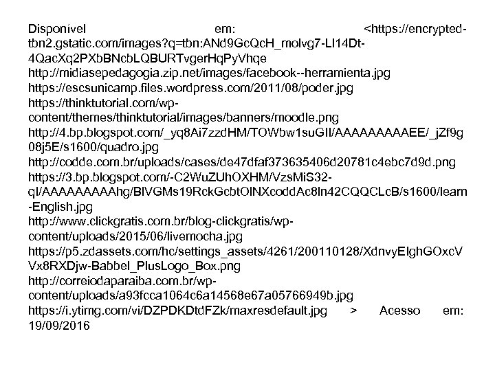 Disponível em: <https: //encryptedtbn 2. gstatic. com/images? q=tbn: ANd 9 Gc. Qc. H_molvg 7 -Ll 14 Dt 4 Qac. Xq 2 PXb. BNcb. LQBURTvger. Hq. Py. Vhqe http: //midiasepedagogia. zip. net/images/facebook--herramienta. jpg https: //escsunicamp. files. wordpress. com/2011/08/poder. jpg https: //thinktutorial. com/wpcontent/themes/thinktutorial/images/banners/moodle. png http: //4. bp. blogspot. com/_yq 8 Ai 7 zzd. HM/TOWbw 1 su. GII/AAAAAEE/_j. Zf 9 g 08 j 5 E/s 1600/quadro. jpg http: //codde. com. br/uploads/cases/de 47 dfaf 373635406 d 20781 c 4 ebc 7 d 9 d. png https: //3. bp. blogspot. com/-C 2 Wu. ZUh. OXHM/Vzs. Mi. S 32 q. I/AAAAAhg/Bl. VGMs 19 Rck. Gcbt. Ol. NXcodd. Ac 8 ln 42 CQQCLc. B/s 1600/learn -English. jpg http: //www. clickgratis. com. br/blog-clickgratis/wpcontent/uploads/2015/06/livemocha. jpg https: //p 5. zdassets. com/hc/settings_assets/4261/200110128/Xdnvy. EIgh. GOxc. V Vx 8 RXDjw-Babbel_Plus. Logo_Box. png http: //correiodaparaiba. com. br/wpcontent/uploads/a 93 fcca 1064 c 6 a 14568 e 67 a 05766949 b. jpg https: //i. ytimg. com/vi/DZPDKDtd. FZk/maxresdefault. jpg > Acesso em: 19/09/2016
